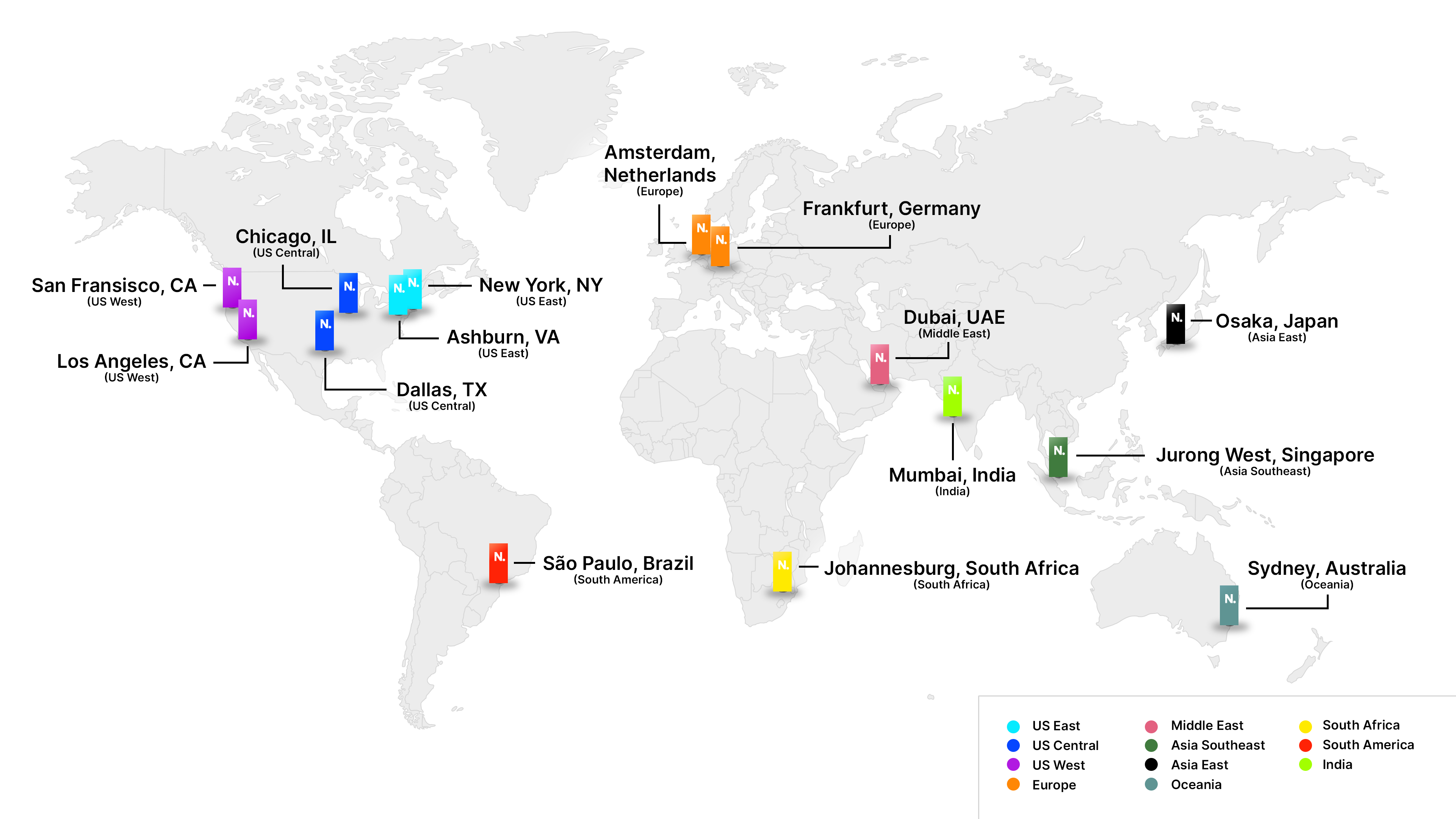 Normcore provides a set of high-level regions designed to make sense when displayed to users. Each region is backed by multiple datacenters across multiple cloud providers for redundancy.